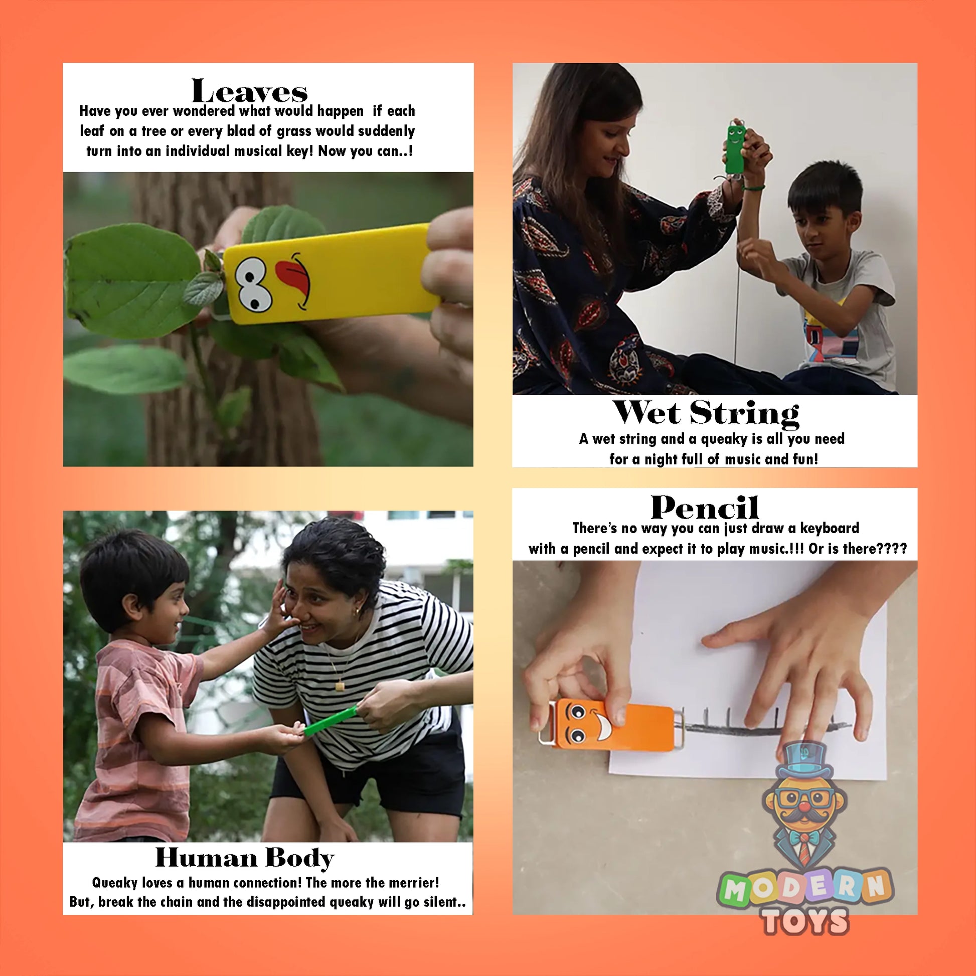 It works on the principle of a closed circuit. The moment Queaky senses that the circuit is closed meaning there is a loop for the current to flow, it gives out a shout. The tone is based on how much resistance is present in the circuit. You can play music with Queaky with leaves on a tree, or a little water and a string, or even just with your fingers if you can master it. You can test different materials, use it to prank people around you, or even just cure some boredom. Batteries- depends on how much you use it! But be sure to not leave the switch on when not in use. And in case it dies out before you’re done, you can replace the batteries with 2 regular coin cells.